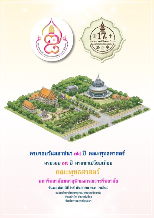 เชิญร่วมงาน วันครบรอบวันสถาปนา ๗๘ ปี คณะพุทธศาสตร์ครบรอบ ๑๗ ปี ศาสนาเปรียบเทียบคณะพุทธศาสตร์และภาควิชาศาสนาและปรัชญา มหาวิทยาลัยมหาจุฬาลงกรณราชวิทยาลัยวันพฤหัสบดีที่ ๒๕ กันยายน พ.ศ. ๒๕๖๘ณ มหาวิทยาลัยมหาจุฬาลงกรณราชวิทยาลัยตำบลลำไทร อำเภอวังน้อย จังหวัดพระนครศรีอยุธยา
